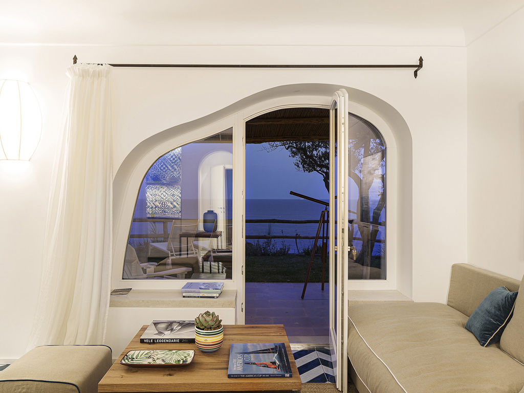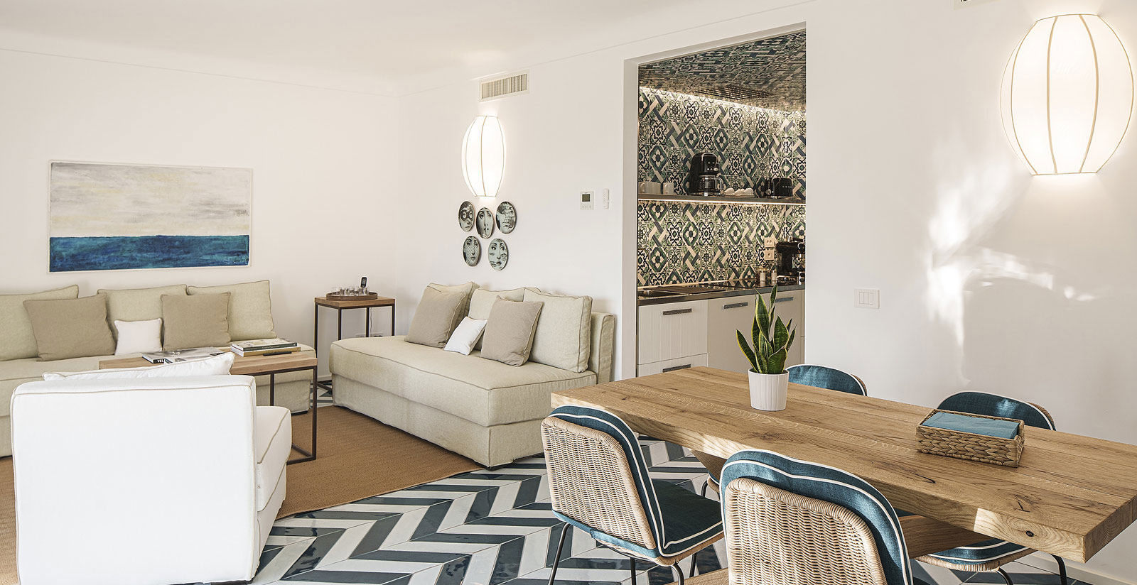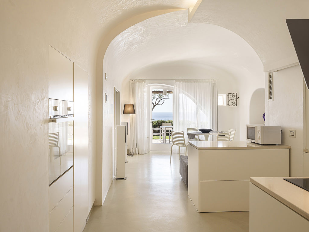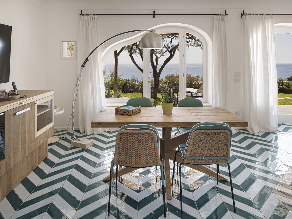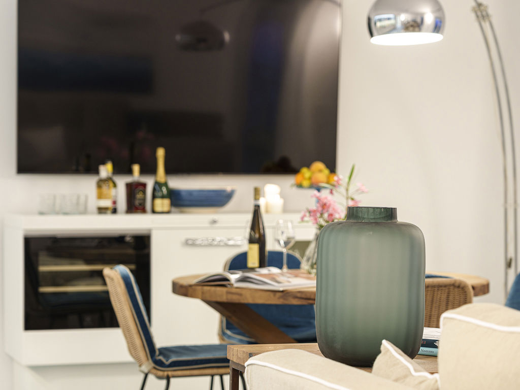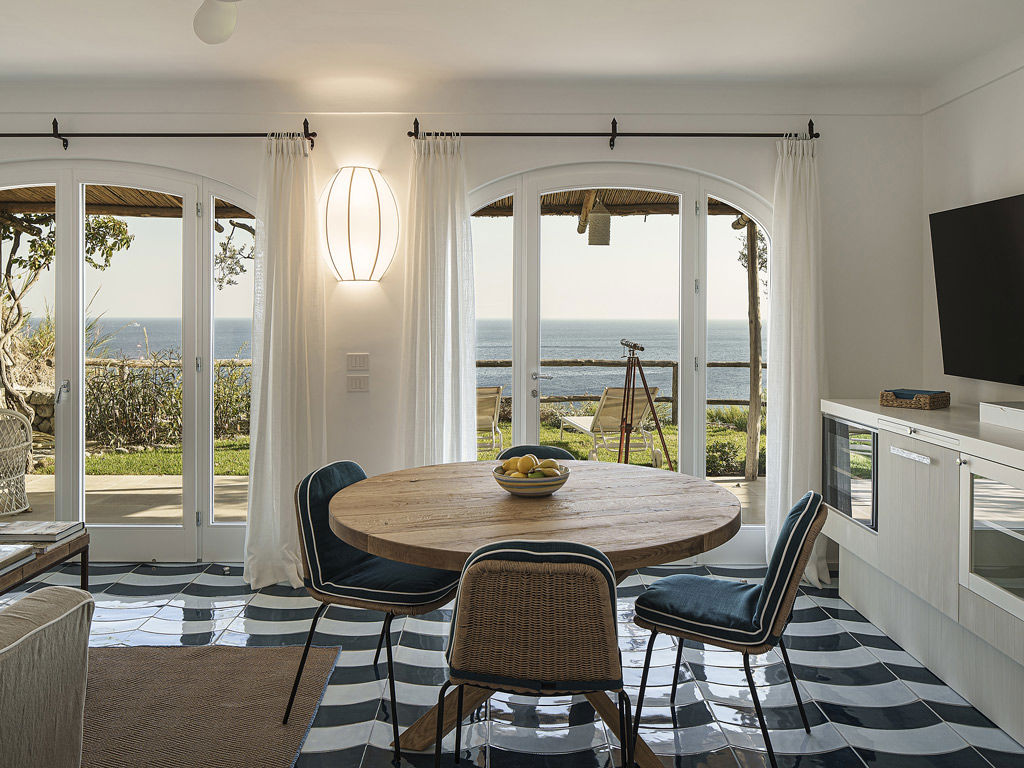Die Villa bietet einen weiten Blick auf die Natur und das Meer. Im Inneren befindet sich eine raffinierte mi-Farbe von Blau über grün bis weiß in einer süßen mediterranen Symphonie.