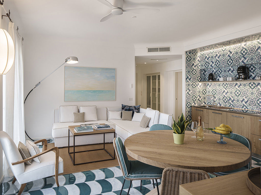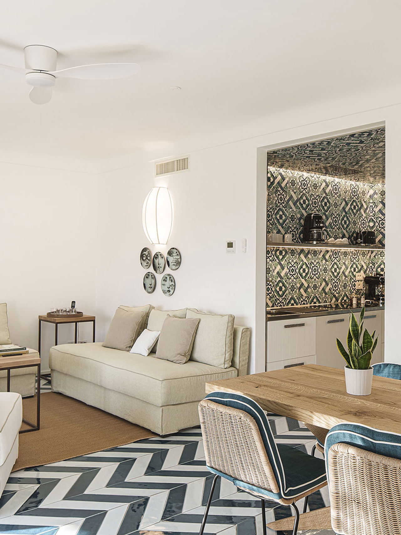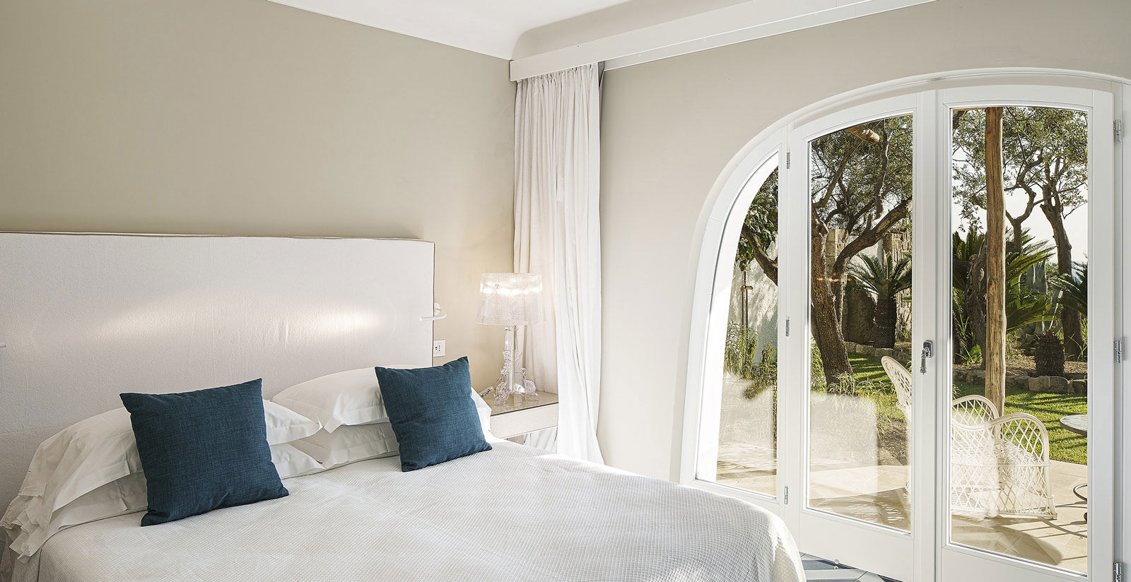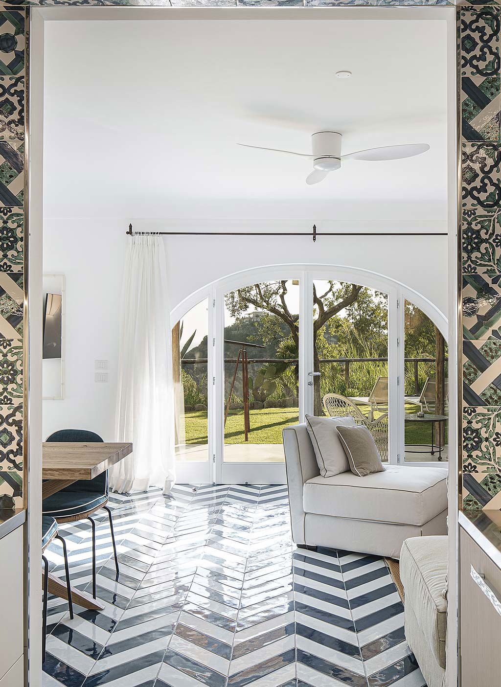 Die Villa bietet einen weiten Blick auf die Natur und das Meer. Im Inneren befindet sich eine raffinierte mi-Farbe von Blau über grün bis weiß in einer süßen mediterranen Symphonie.