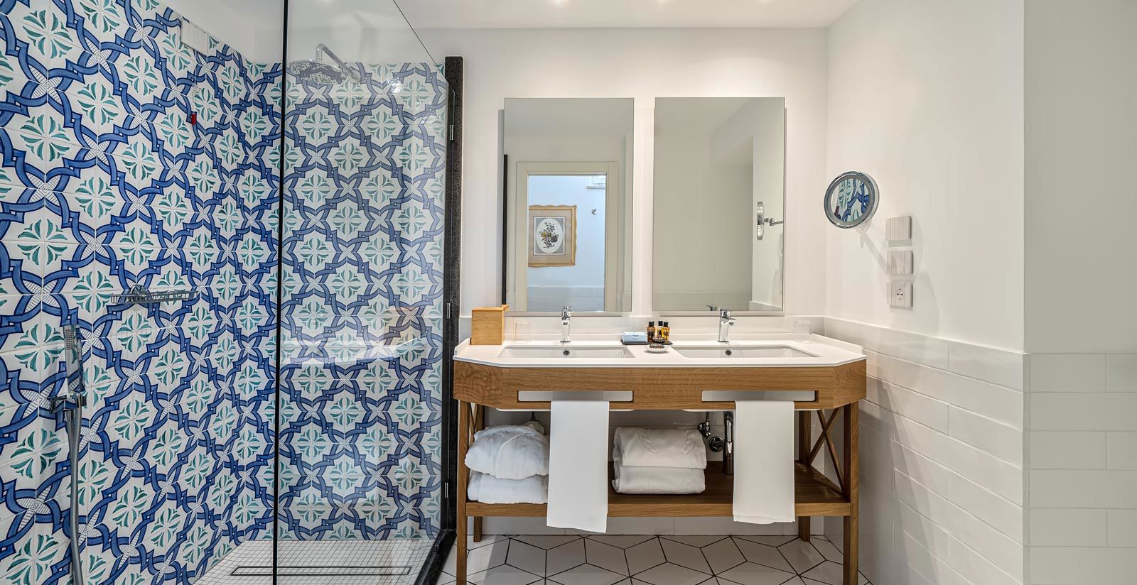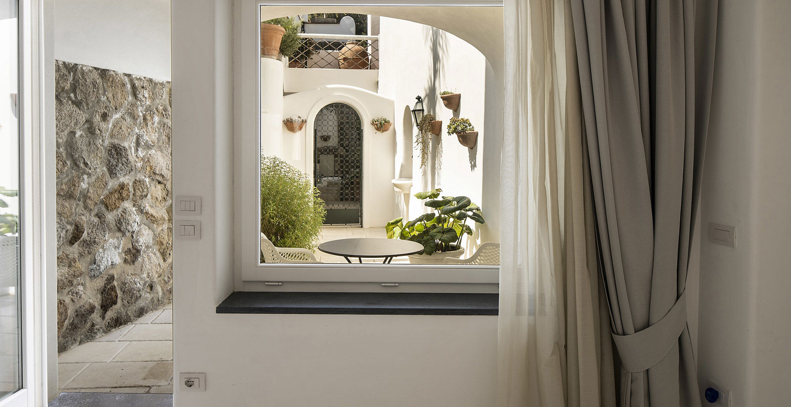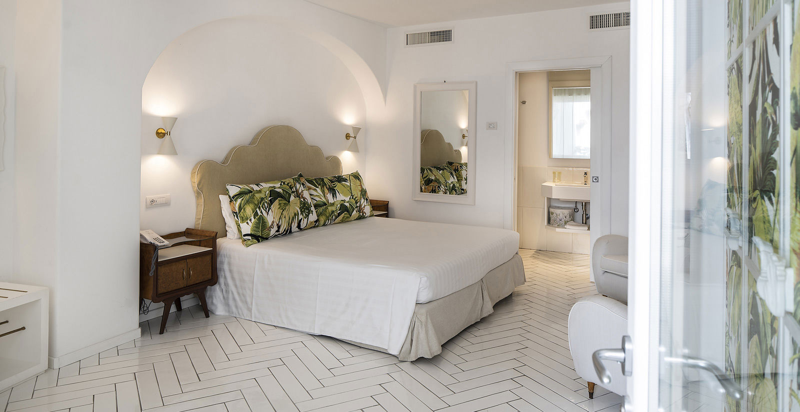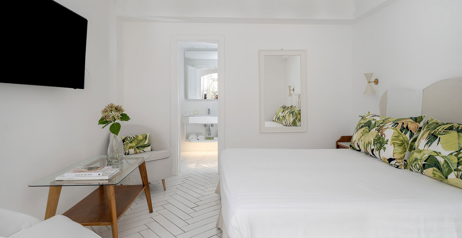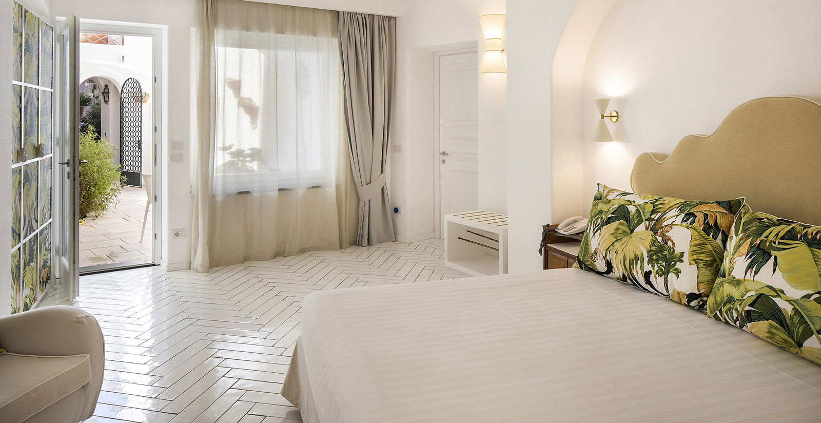 Das heimelige, gemütliche Superior Zimmer mit Terrasse und Gartenblick lädt zur Entspannung ein und ist der ideale Ort für einen Aufenthalt ganz im Zeichen von absoluter Ruhe. Das hell und typisch mediterran eingerichtete Zimmer ist von gefliestem Boden und Wänden in hellen, leuchtenden Farbtönen geprägt.
