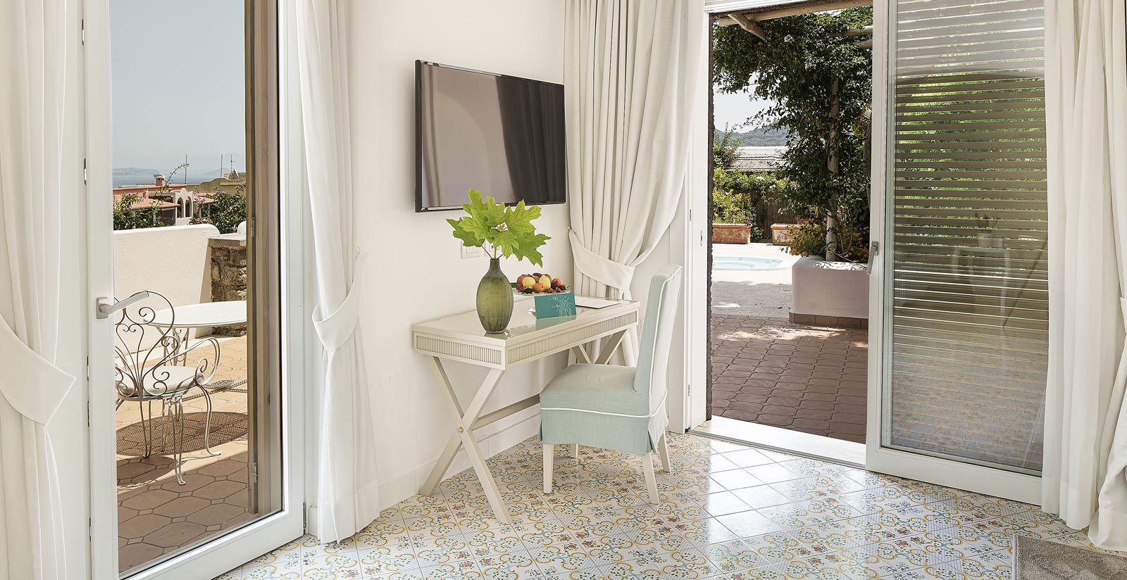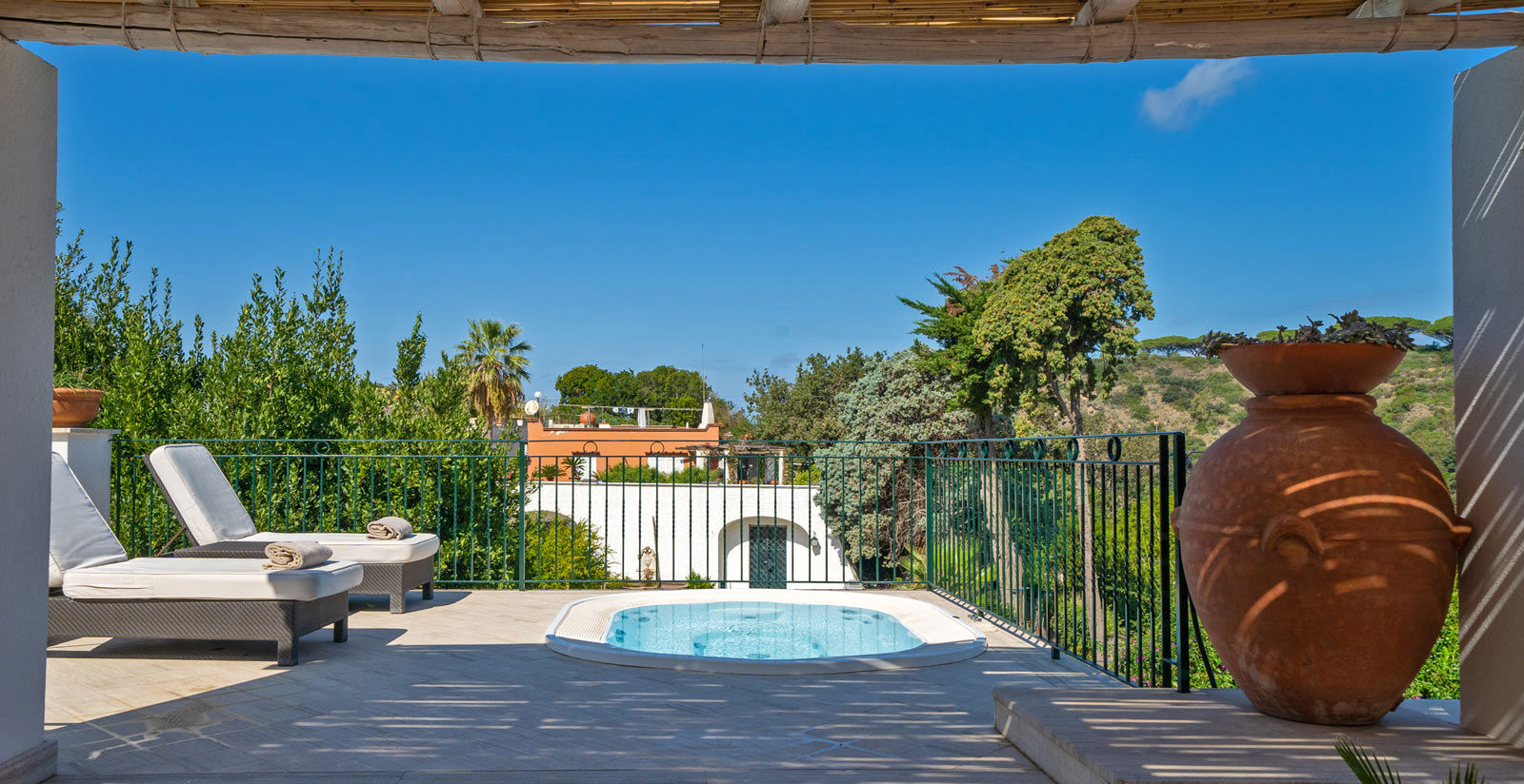 Relaxing while soaking in the Jacuzzi on the terrace overlooking the park is the ideal setting for a perfect holiday! The colourful Vietri tiles form the backdrop to the refined furnishings, in total harmony with the surrounding nature. Cosy and bright, the Open Plan Suites have a living area with a comfortable sofa bed for one.